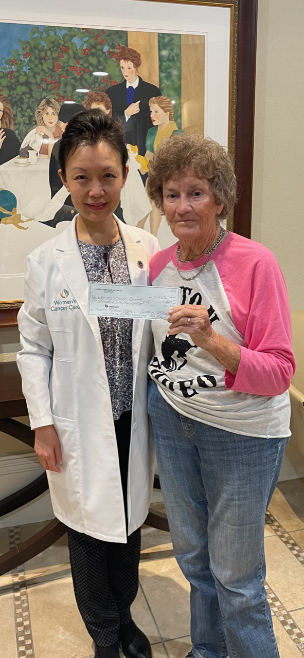 Lion Telie Spurlock presented a Laton Lions Club check for $1600 to the Womens Cancer Care Center in Fresno.