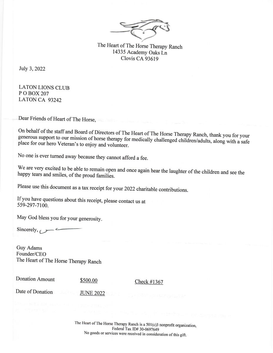 We thank our Laton Lions Rodeo Fans for supporting the Laton Lions Club Tough Enough to Wear Pink fundraiser at our 58th Rodeo which allowed us to make this donation.