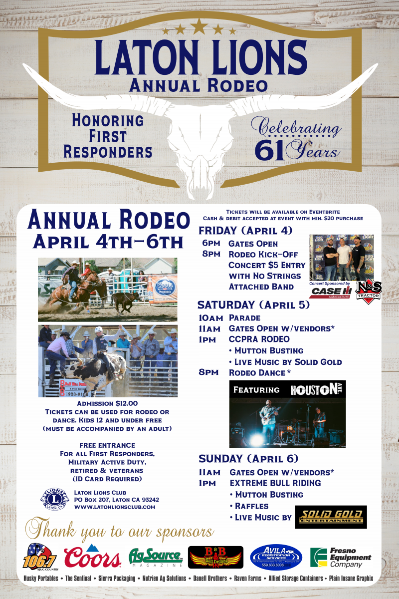 Please click on the link if you are interested in becoming a rodeo sponsors for the Laton Lions Club Rodeo!
